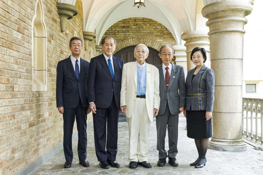 大隈講堂・回廊での記念写真:左から須賀副総長、田中総長、田中氏、濱住氏、齋藤副総長
