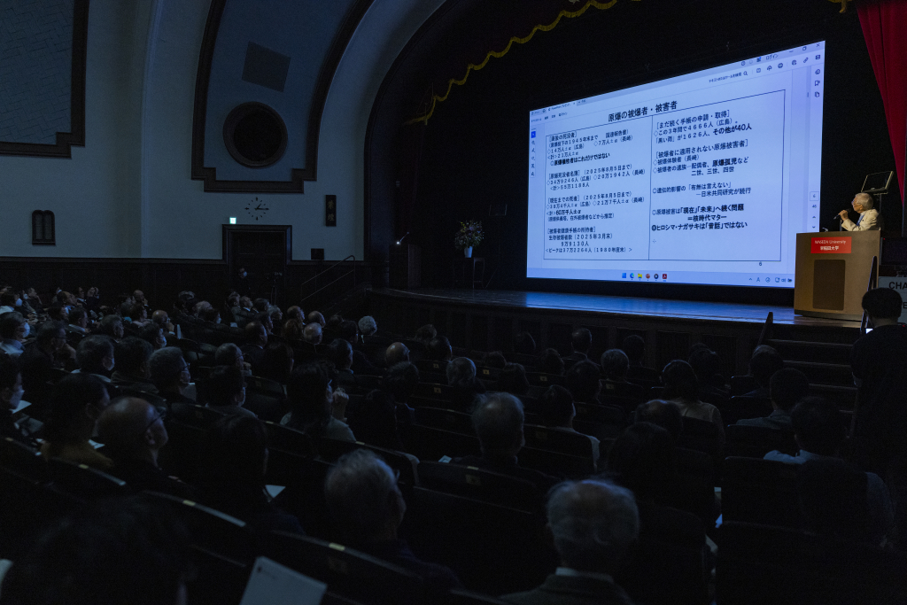 田中氏は冒頭にて、原爆投下から80年を経た現代への眼差しとともに、日本被団協と早稲田大学の関係性を語りました。