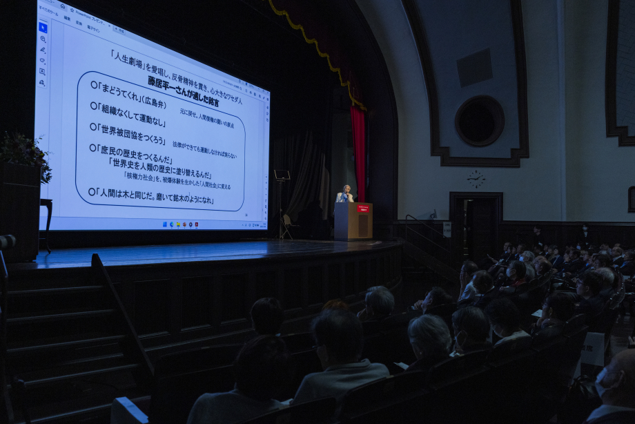 「人類の危機を救おうとする日本被団協の姿勢に感銘を受け、被爆者であることを隠して生きていた自分を、『なんと心の狭い人間なのだろう』と反省しました。なかでも大きかったのは、藤居平一さんの存在です。日本被団協の初代の代表委員の1人であり事務局長も兼任した藤居さんは、早稲田大学を卒業後、街頭運動などを重ね、広島で開かれた第1回原水爆禁止世界大会の旗振り役として、被爆者運動に貢献しました。その後も原水爆禁止運動は前進していきますが、第4回大会は会場探しが困難を極めます。藤居さんは、当時の早稲田大学の大濱総長に対し、原水爆禁止はヒューマニズムの運動であることを訴え、記念会堂が貸し出されたこともありました。生涯をかけて運動に取り組んだ藤居さんは、1996年にこの世を去りましたが、『世界史を人類の歴史に塗り替えるんだ』『人間は木と同じだ。磨いて銘木のようになれ』という言葉を遺しました。反骨精神を貫くワセダ人であったことを、皆さんにお伝えしたいのです」