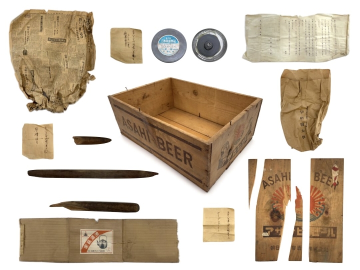 早稲田大学歴史館の収蔵庫に保管されていた木製の古いビール箱の中から資料が発見されました。箱の裏面には「昭和二十七年五月八日事件」と記載されており、ニュースフィルムや木片などが収められていました。