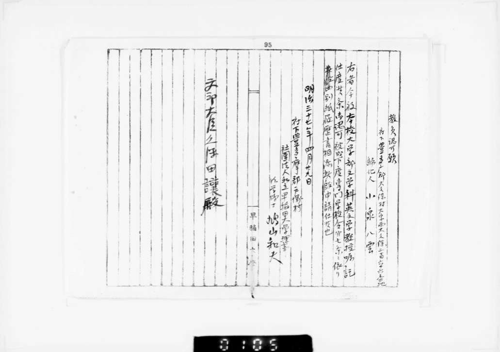 また早稲田大学歴史館所蔵資料 早稲田大学本部書類 5-004-047「教員認可願(大学部文学科英文科)〔小泉八雲〕」は、小泉八雲を大学部文学科英文学教授として迎え入れるため、大学理事・鳩山和夫名で文部大臣・久保田譲に認可を求めています。