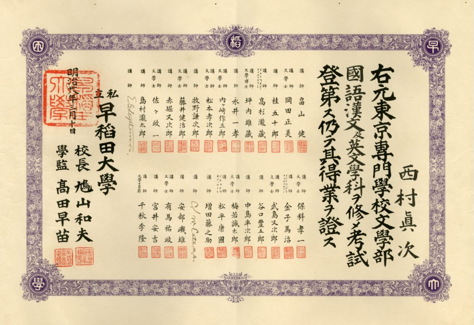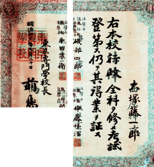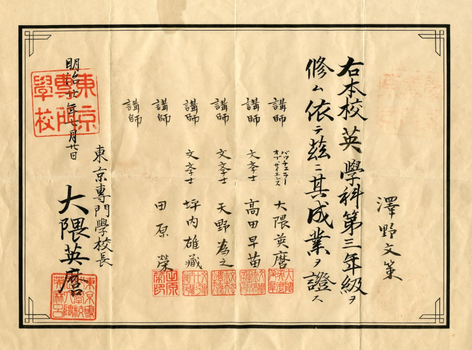 東京専門学校時代の卒業証書など