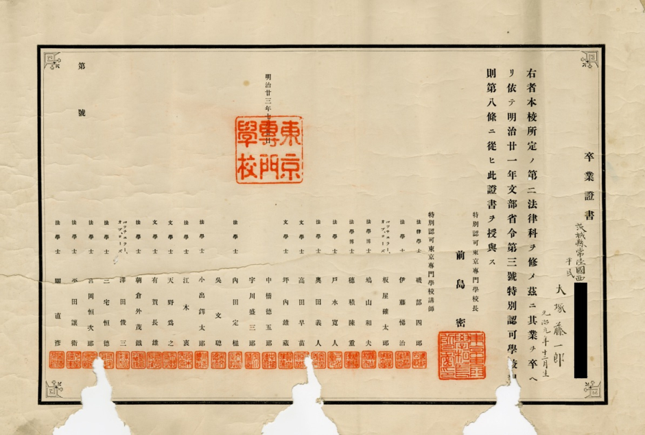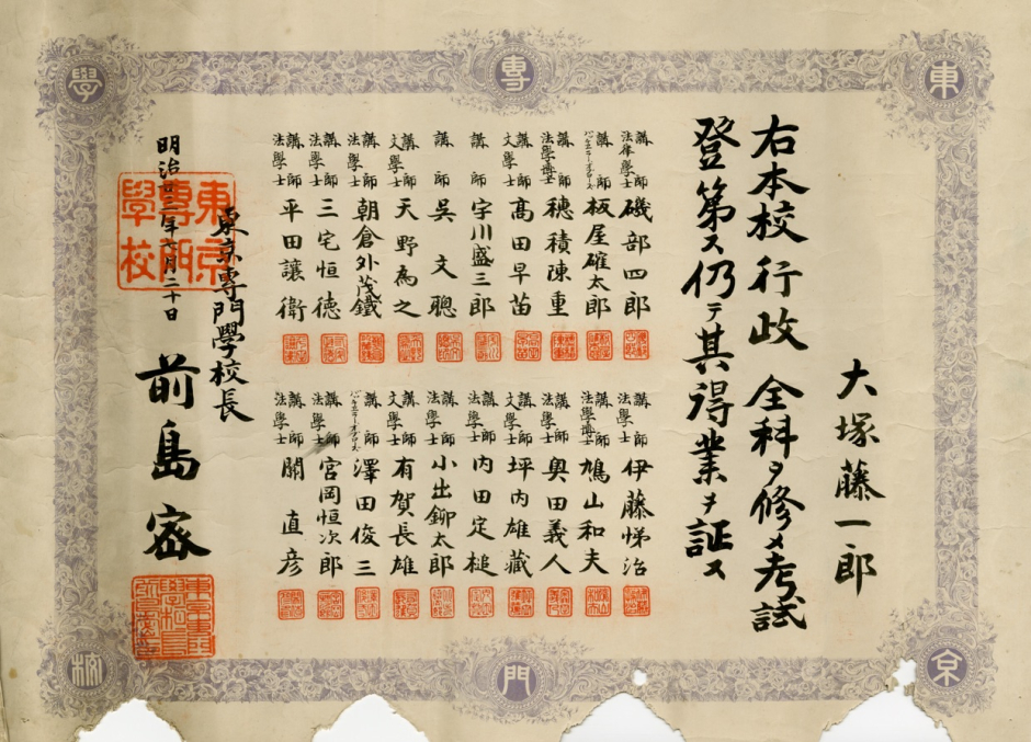 同じく大塚藤一郎に授与されたものだが、こちらは「得業ヲ証ス」「明治廿三年」(1890年)となっている。講師連・校長名は手書き印刷と思われ、飾り罫には「東京専門学校」と刷られている。