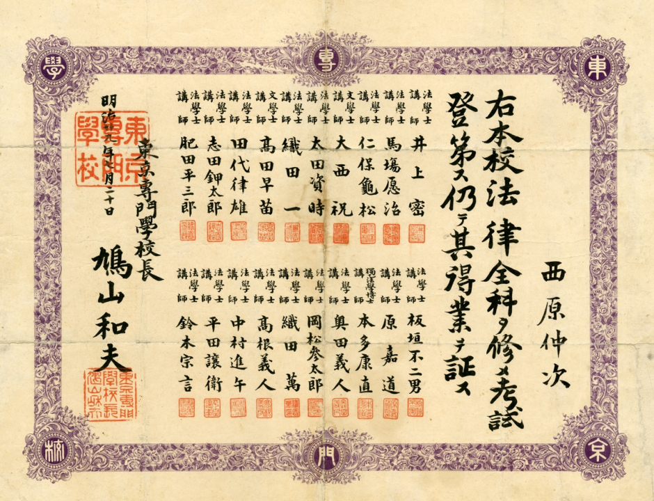 史編・大学史旧蔵 1999年度西原靖彦氏寄贈資料1「〔卒業証書〕西原仲次 東京専門学校法律科卒業」
