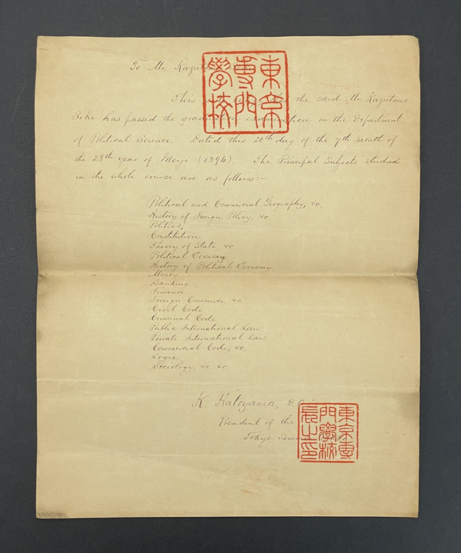 1894年7月20日、セキ・カズトモが政治経済科の卒業試験に合格したことを証し、及び履修科目の一覧を示している。