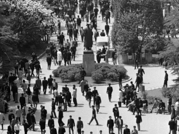 早稲田キャンパスのほぼ中央に建立された大隈重信像。現在のものは総長ガウン姿ですが、じつは「3代目」です。1932年(昭和7)の本学創立50周年を記念して建立されました。
