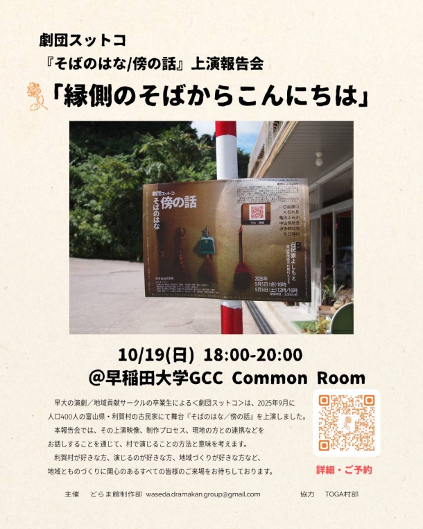 早大の演劇/地域貢献サークルの卒業生による<劇団スットコ>は、2025年9月に人口400人の富山県・利賀村の古民家にて舞台『そばのはな/傍の話』を上演しました。