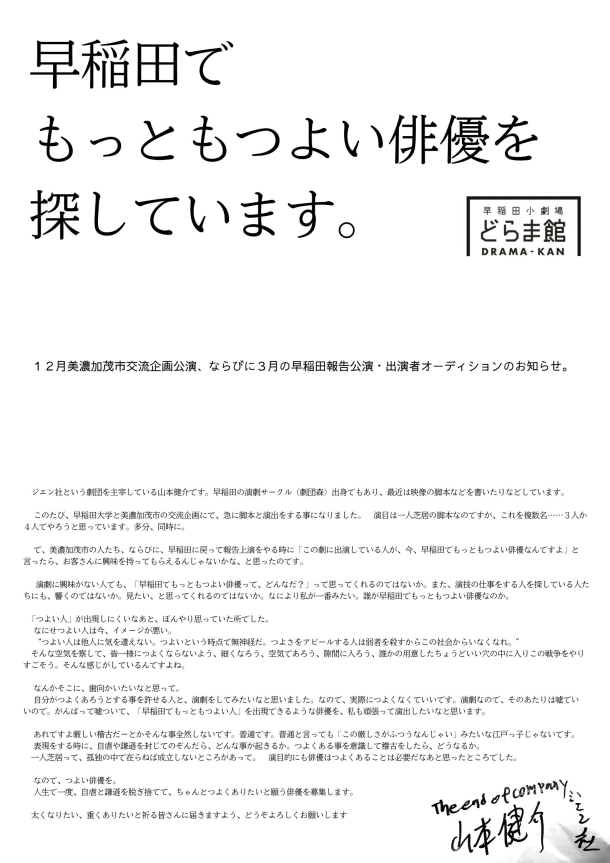 で、美濃加茂市の人たち、ならびに、早稲田に戻って報告上演をやる時に「この劇に出演している人が、今、早稲田でもっともつよい俳優なんですよ」と言ったら、お客さんに興味を持ってもらえるんじゃないかな、と思ったのです。
