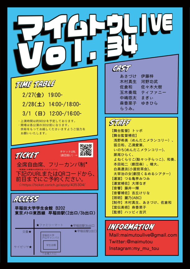 - 舞台監督補佐:浅野希美(めんだこメランコリー)、狐日和、乙満愛葉、いのち(めんだこメランコリー)、扉尾ひらく、よねくらりこ(駄々っ子らっこ)、和奏、本田祐二(劇団森)、晴大、白黒濃淡(小屋前茶会)、太宰治の女(劇団くるめるシアター)