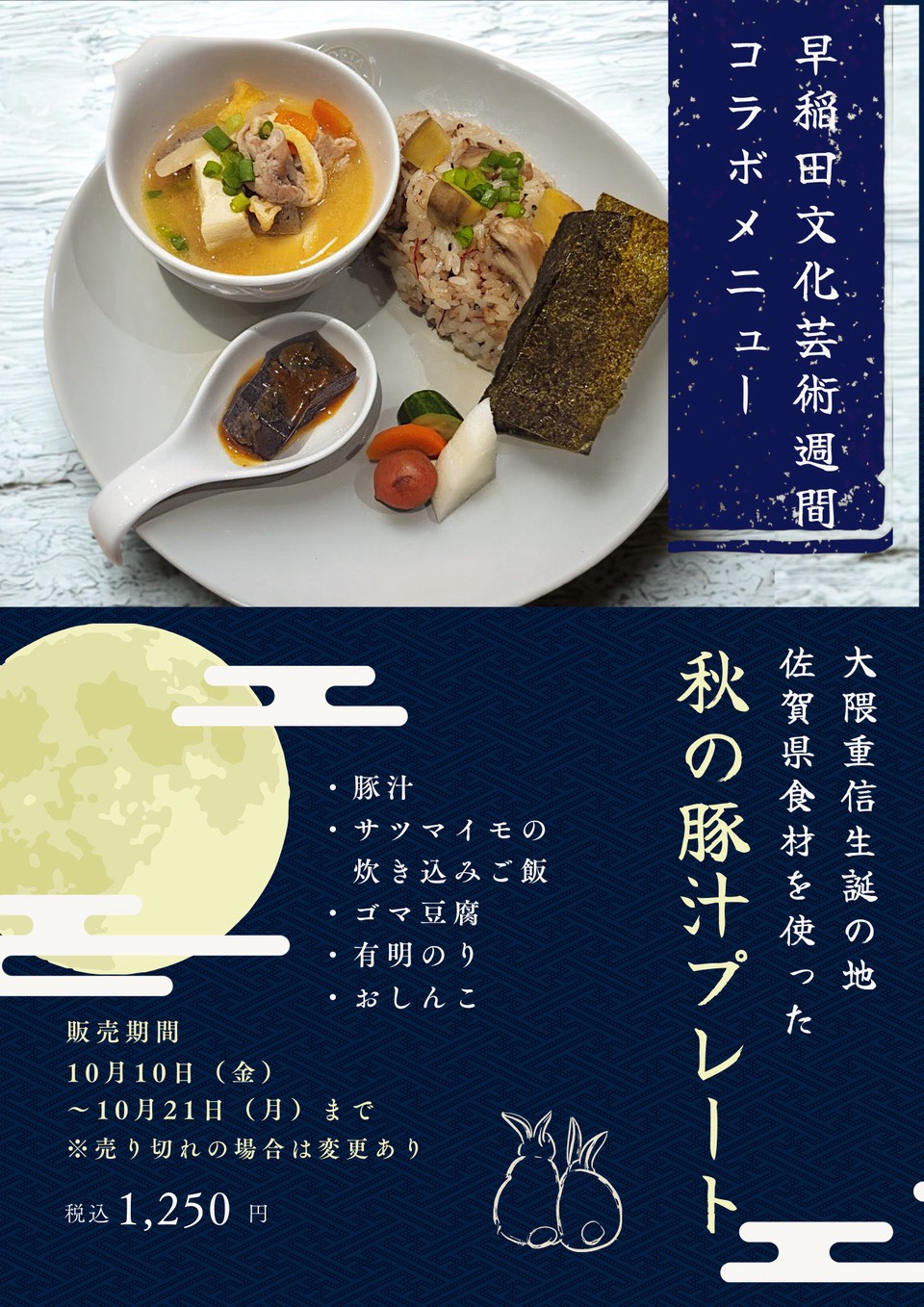 A&A CAFEさんが「早稲田文化芸術週間」限定のスペシャルコラボメニュー「大隈重信生誕の地 佐賀食材を使った秋の豚汁プレート」。を開発しました。秋らしく、「豚汁」と「さつまいもきのこ炊き込みご飯」に、佐賀県の「胡麻豆腐」と「のり」です。ぜひ、お楽しみください。癒されます。