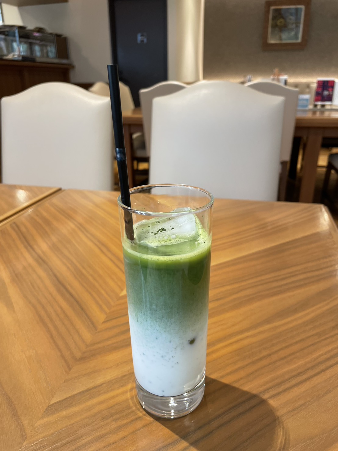 見た目がとても綺麗な抹茶オレ。HotとIcedを選ぶことができます。アイスクリームと合わせると、美味しい。