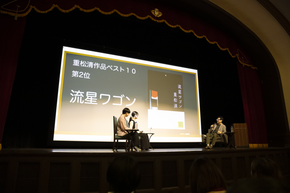 本イベントは、「早稲田文化芸術週間 2025」のイベントとして開催されました。早稲田大学文化推進学生アドバイザーを務める、現役生の杉山香乃さん、西村凪紗さんの司会のもと、重松清氏が舞台上に登場します。