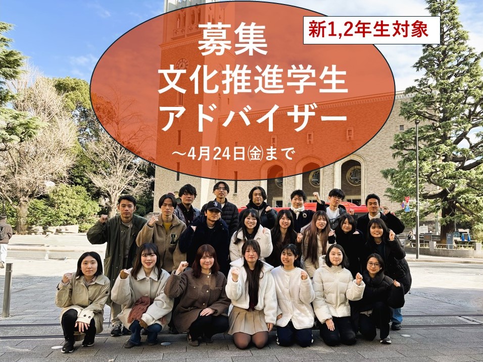 文化推進学生アドバイザーの募集は毎年12月に行っていますが、今回は、4月から新たに入学した1年生と新2年生を対象に募集します。