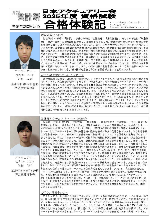 ![]() 特別号(2026年3月15日発行) 日本アクチュアリー会資格試験 合格体験記 |