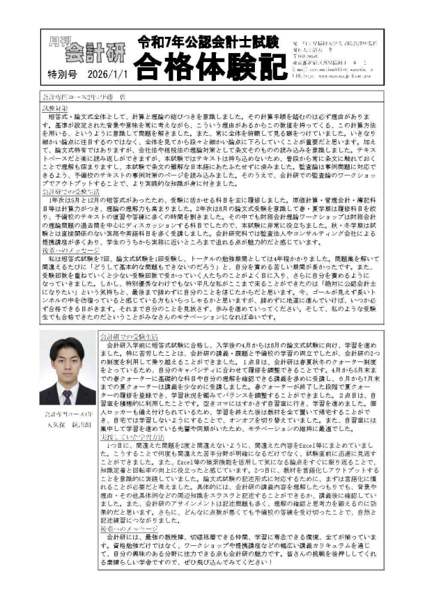 ![]() 特別号(2026年1月1日発行) 令和7年公認会計士試験 合格体験記 |