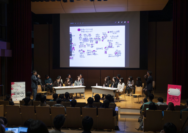 また、講義中はアートディレクターの方が議論の内容をリアルタイムで「グラフィックレコーディング(絵や図表でまとめる手法)」で描き出し、思わずスクリーンに釘付けになるようなイラストで、視覚的にもセッションを楽しむことができました。