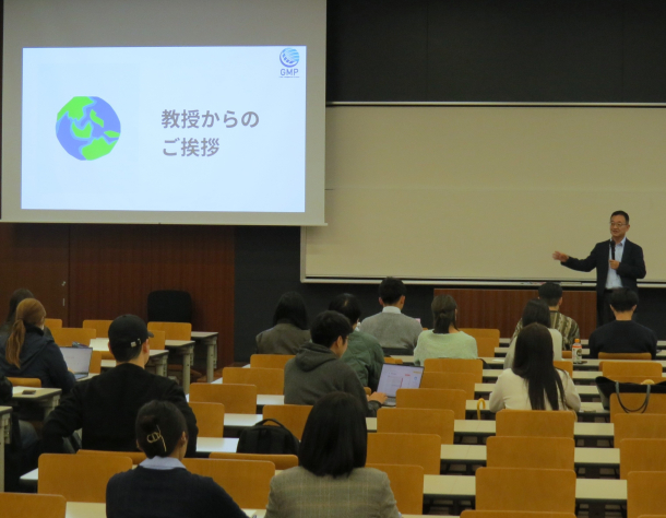 開会の挨拶ではGMPディレクターを務める中出先生が登壇し、「ゼミを超えてグローバルに学習できる」というGMPの魅力についてお話をいただきました。