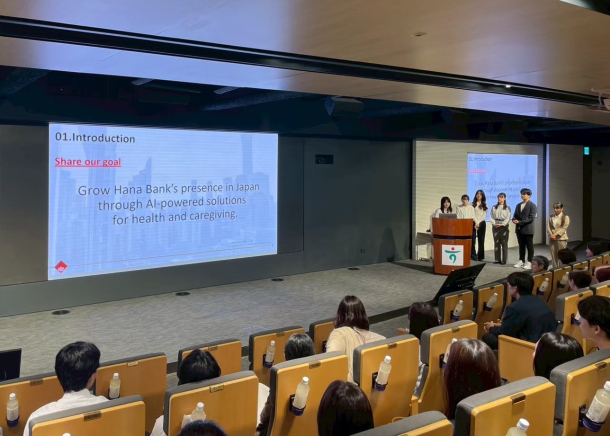 9月25日にAグループは、MUJI Korea様とHANA Bank様を訪問しました。午前のMUJI Korea様への訪問では、各グループが「高齢化、地方消滅が進んでいる韓国における持続成長に向けた無印良品韓国の経営戦略」を考え、プレゼンテーションを行いました。各グループは、「子育て支援戦略」、「若者住居支援戦略」、「都市×地方二面戦略」の3つの視点からそれぞれ経営戦略の提案を行いました。質疑応答の際には、現場の社員の方から核心をついた質問をいただきました。