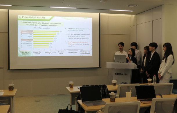 当日は、各チームが「ASEANの農業と気候変動リスクへの保険連携」、「インド再々保険市場への展開」、「アフリカの自然災害及び再生可能エネルギーにおける再保険」という3つの視点からそれぞれ提案を行いました。Korean Reの皆様からは、的確なフィードバックに加え、会社説明や今後のビジョンに関する貴重なお話を伺うことができました。