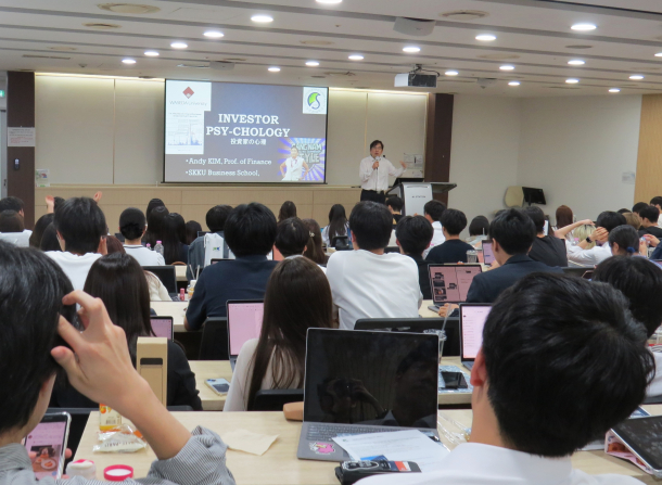 特別講義では、Yongsuk Kim先生が「From Data to Decisions: AI’s Evolution in Platform Business」という論題で、プラットフォームビジネスにおけるAIの発展について要点を絞って分かりやすく教えてくださいました。Andy Kim先生は「Investor Psychology」という論題で、株式市場の投資家の心理についてユーモアを交えながら複雑な内容を直感的に理解できるように解説していただきました。お二人の講義では、講義中に何度も笑いが起きるなど、知的でありながら楽しく温かい雰囲気で学習することができました。