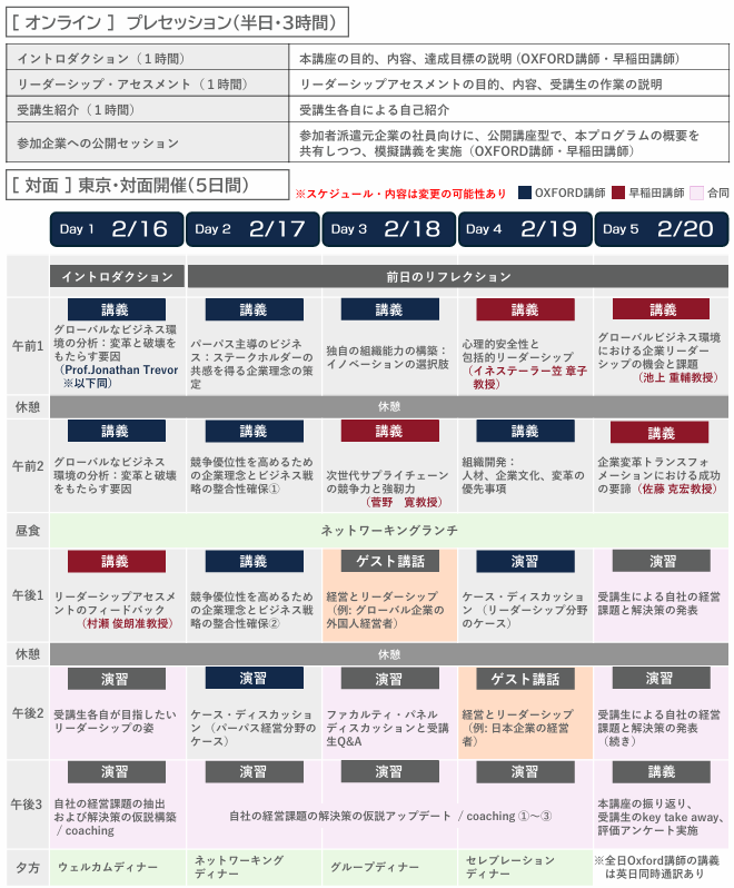 本プログラムは、世界トップレベルのオックスフォード大学サイードビジネススクールと、早稲田大学ビジネス・ファイナンス研究センターが共同開発し、グローバルな知見を日本の文脈に深く落とし込み、5日間集中で次世代グローバルリーダーの育成を目指します。