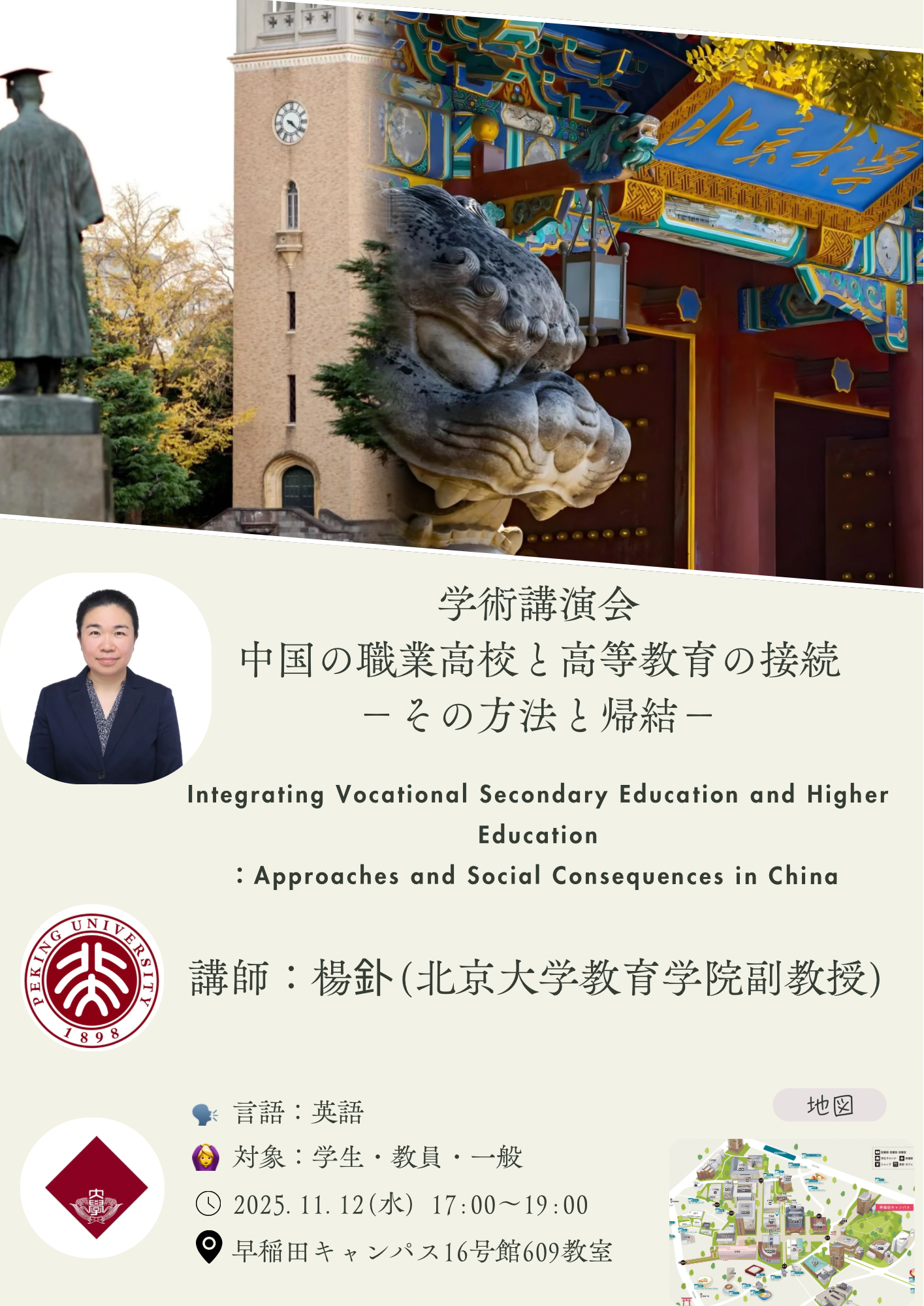 - 開催概要:China has built the world’s largest vocational and higher education systems. Recent policy initiatives seek to bridge these two sectors by expanding tertiary education opportunities for graduates of vocational secondary schools. However, the developmental trajectory and labor market implications of these integration efforts remain insufficiently understood. This study situates China’s experience within a comparative framework, examining how countries with distinct national skill formation systems construct pathways between vocational and academic tracks. Drawing on the 2022 and 2025 national surveys of vocational college graduates, the analysis explores the academic progression and career outcomes of individuals who have traversed both vocational secondary and tertiary institutions. The findings illuminate the evolving role of vocational education in contemporary Chinese society and reveal emerging mechanisms of social reproduction in the aftermath of the Great Higher Education Expansion of the late 1990s.(中国の中等教育において大きな比重を占める職業高等学校卒業生に対して、いかにして職業高等教育の機会を付与するかは重要な政策課題となっている。2022年と2025年に実施された調査をもとに、職業高校から職業高等教育機関へと移行した生徒・学生の学業の進捗、その後のキャリアの進展を検討することで、現代中国における職業教育の果たす役割の大きさを明らかにするとともに、1990年代後半に高等教育拡大期以降の社会的再生産のメカニズムを検討することを目的とする。)