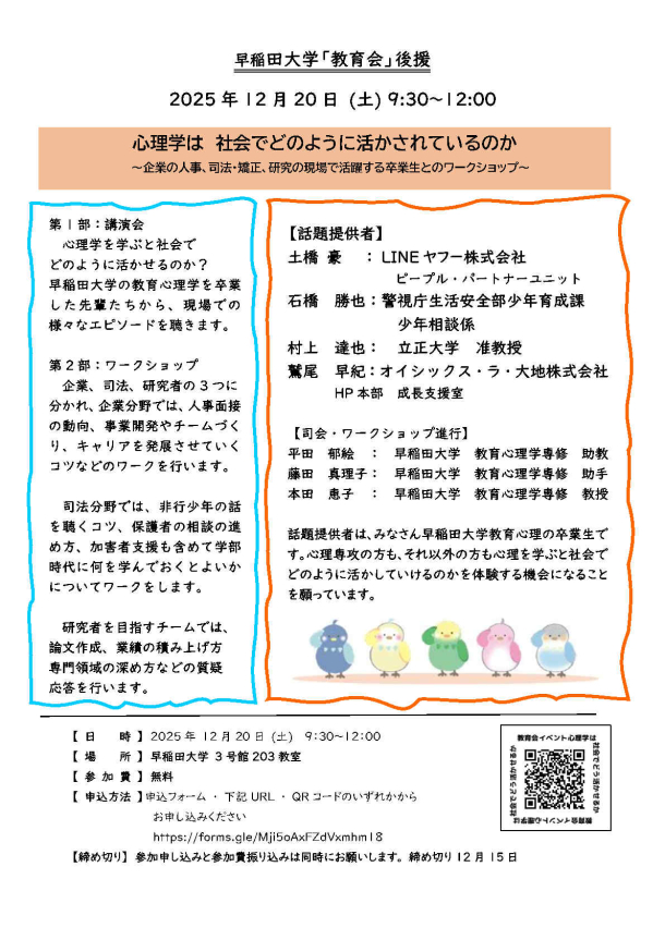 - 【教育会】「心理学は 社会でどのように活かされているのか~企業の人事、司法・矯正、研究の現場で活躍する卒業生とのワークショップ~」