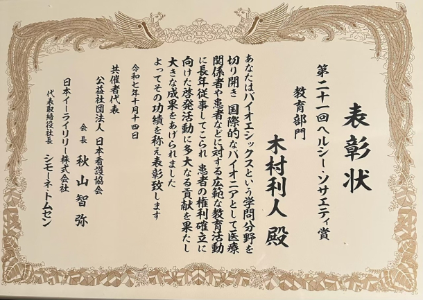 木村氏は、日本におけるバイオエシックス(生命倫理)の分野を切り拓いた国際的パイオニアの一人です。早稲田大学での教育活動やWHOでの知見を活かし、患者の権利やインフォームド・コンセントの普及に尽力。全国での講演・研修や「患者の権利章典」の起草など、市民や医療現場の意識向上に幅広く貢献しました。さらに日米バイオエシックス会議の開催、日本初の大学必修科目の開講など、半世紀以上にわたり国内外で教育と研究を推進。2024年には日本キリスト教文化協会から顕彰を受けるなど、学術と実践の両面で顕著な業績を残しています。