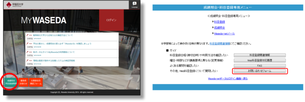 まず問い合わせをする前に「科目登録の手引き」をご確認下さい。科目登録の手引きで説明されていることを質問するケースが非常に多いです。それでも解決しない場合はMyWaseda TOP画面>「成績照会・科目登録専用」メニュー> 「お問い合わせフォーム」から必要事項を記入して送信してください。言い間違いや聞き間違いによる登録ミス等のトラブル防止のため、電話によるお問い合わせは受け付けておりません。