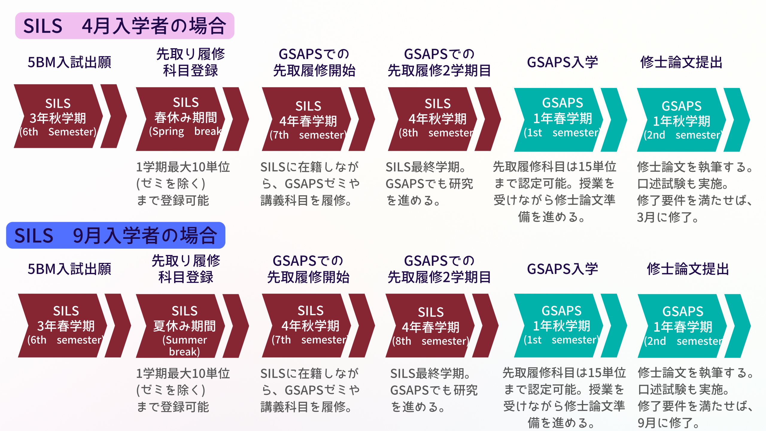 5BMプログラムは、早稲田大学国際教養学部(SILS)の学生が5年間(SILS4年+GSAPS1年)でSILSの学士号とアジア太平洋研究科(GSAPS)の修士号の両方を取得することを目指すプログラムです。5BMプログラム入試に合格した学生は、SILSでの4年次に先取り履修でGSAPSのゼミと講義科目を1年間履修します。その後GSAPSに入学し、1年間で修了を目指します。