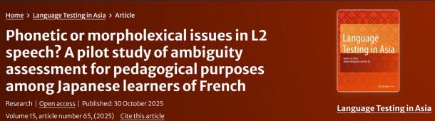 In October 2025, Professor Detey published an Open Access article entitled “Phonetic or morpholexical issues in L2 speech? A pilot study of ambiguity assessment for pedagogical purposes among Japanese learners of French” – in the academic journal Language Testing in Asia (Springer) with Dr V. De Fino and Dr L. Fontan (Archean Labs, France).