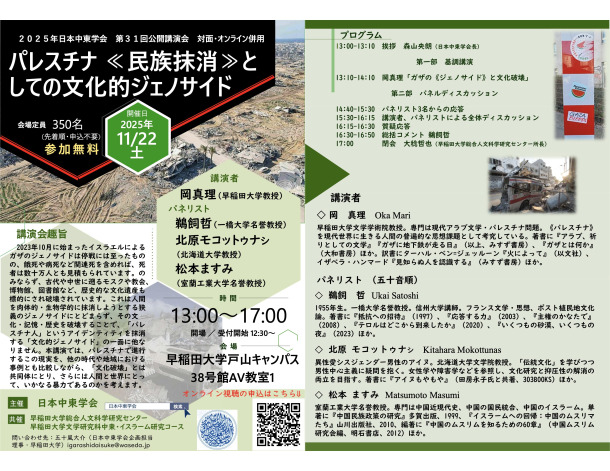 - 【11月22日(土)開催】日本中東学会第31回公開講演会「パレスチナ ≪民族抹消≫としての文化的ジェノサイド」