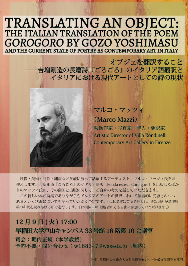 映像・美術・詩作・翻訳など多岐に渡って活躍するアーティスト、マルコ・マッツィ氏をお迎えします。吉増剛造『ごろごろ』のイタリア語訳(Poesia estesa: Goro-goro)を出版したばかりのマッツィ氏に、その翻訳と出版に関して、ご自身の考えを話していただきます。この新しい本が詩集でありながらもイタリアのアートの世界において積極的に受容されつつあるという状況についても語っていただく予定です。(なお講演は英語で行われ、逐次堀内が講演原稿の和訳を読みあげる形で進行します。日本語のみの理解者の方も自由に参加していただけます。)