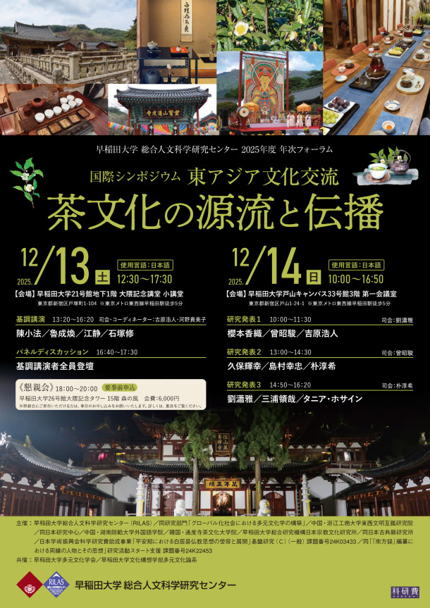 - 【12月13・14日開催】国際シンポジウム「東アジア文化交流 茶文化の源流と伝播」(早稲田大学総合人文科学研究センター 2025年度 年次フォーラム)