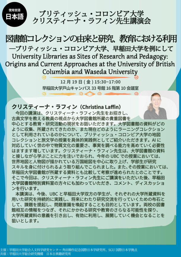 - 【12月19日(金)】クリスティーナ・ラフィン先生講演会 図書館コレクションの由来と研究、教育における利用―ブリティッシュ・コロンビア大学、早稲田大学を例にして University Libraries as Sites of Research and Pedagogy: Origins and Current Approaches at the University of British Columbia and Waseda University