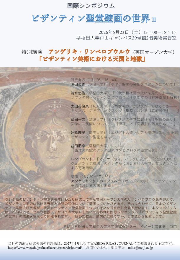 クレタ島のビザンティン聖堂を長年にわたり研究してきた英国オープン大学のA. リンベロプウルウ氏を迎えて、ビザンティン美術における天国と地獄の図像について講演していただきます。それに合わせて、日本のビザンティン美術史研究者が、後期ビザンティン聖堂壁画について様々な視点から発表を行います。本シンポジウムは、2024年5月にセモグルウ教授(テサロニキ大学)を招いて行われたシンポジウム「ビザンティン聖堂壁画の世界」の成果を継承して開催されます。