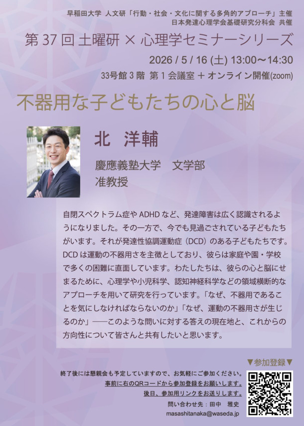 - 【 5月16日(土)開催】心理学セミナーシリーズ「不器用な子どもたちの心と脳」 Psychology Seminar Series
