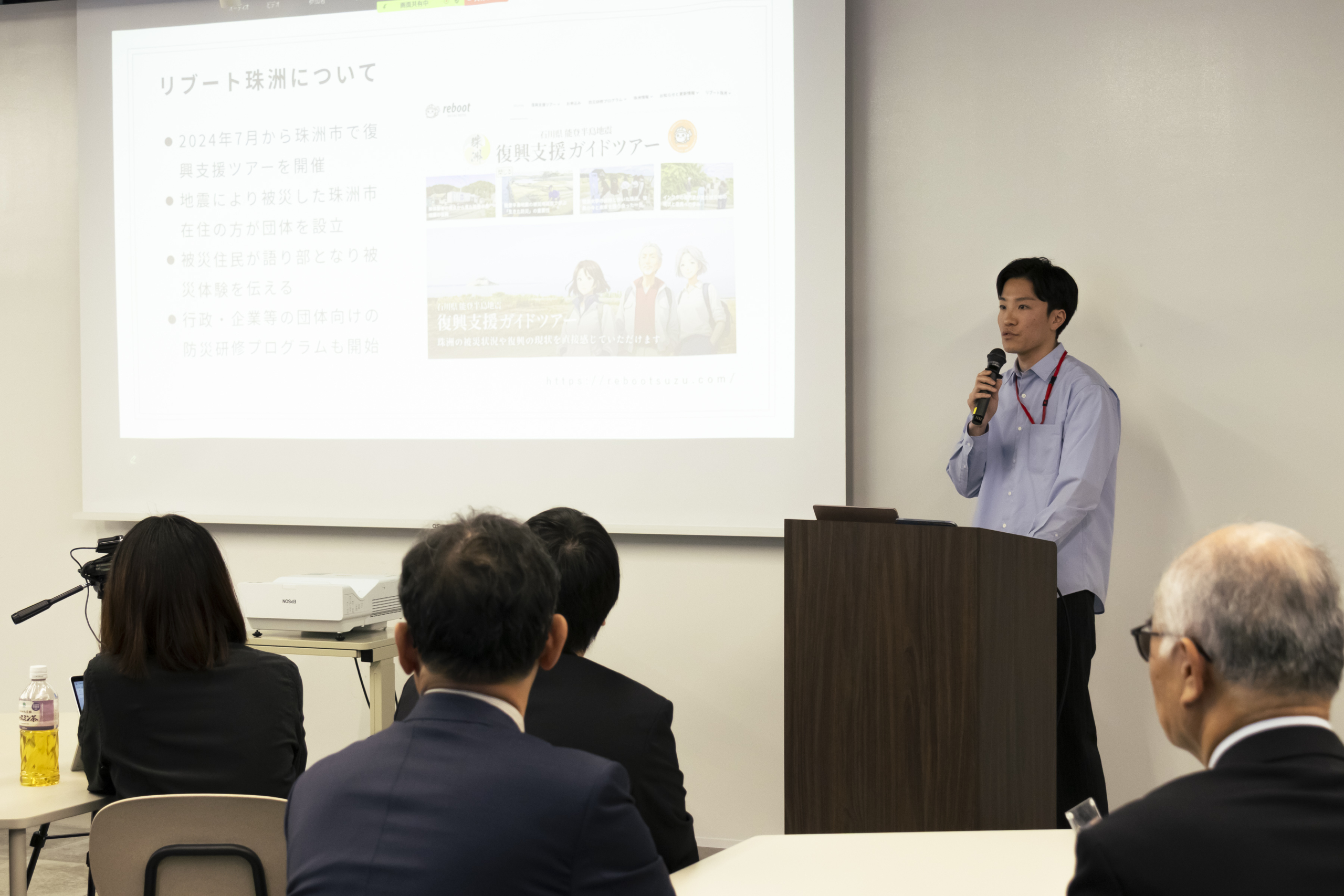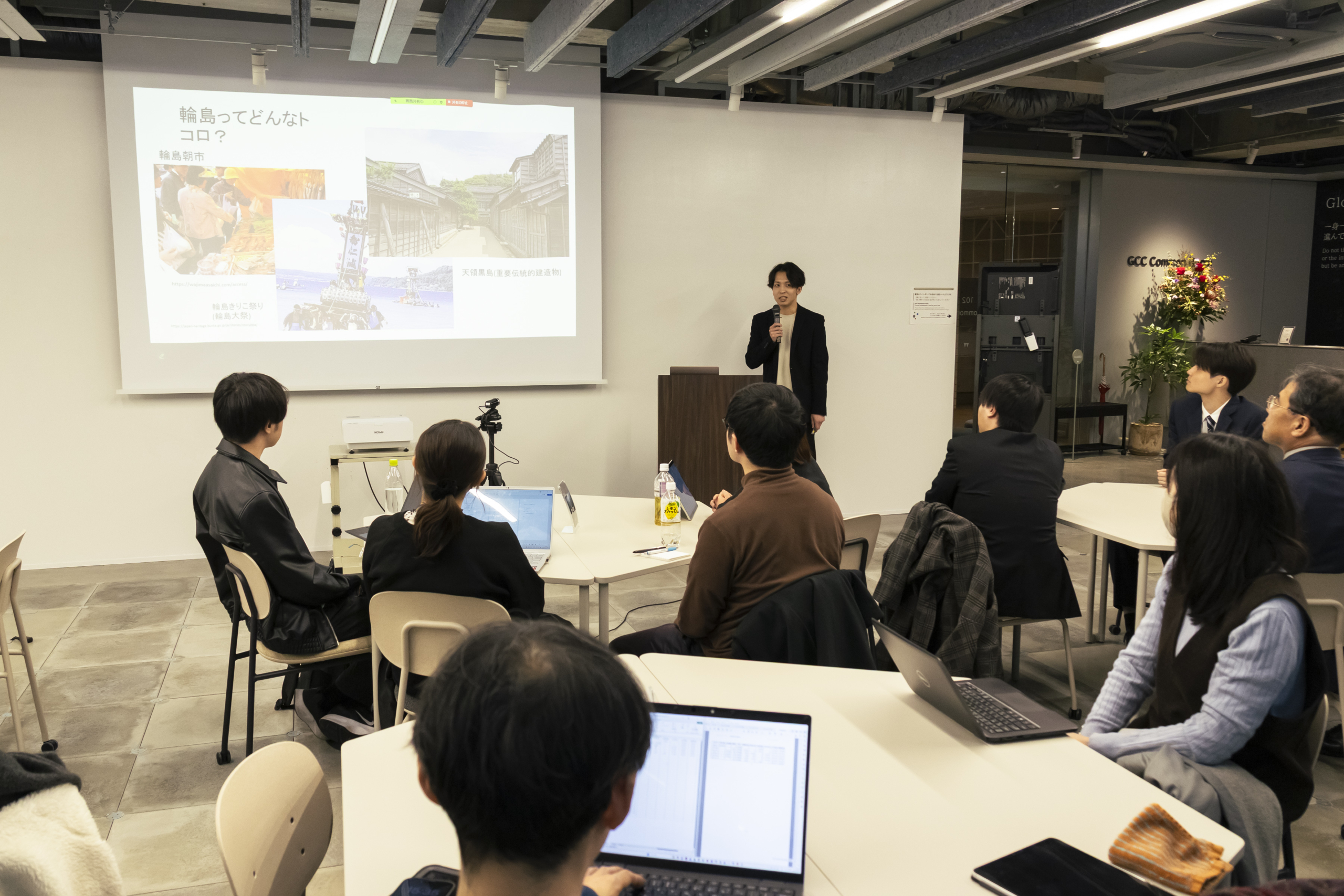 つづいて、法科大学院2年生の伊藤寛之さんが、輪島市の現状を報告。輪島朝市や輪島きりこ祭り、天領黒島など、地域文化や建造物の状況が伝えられました。