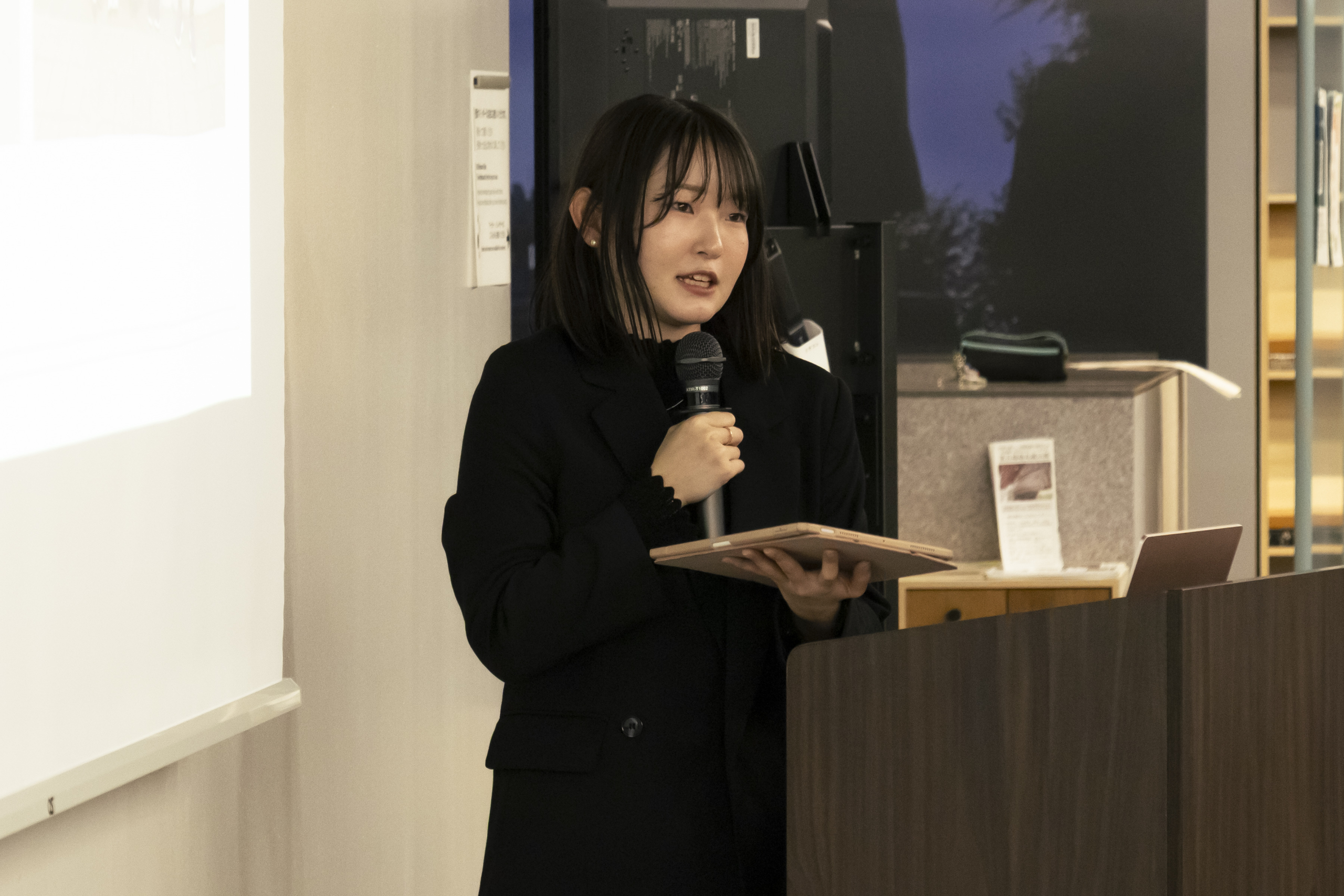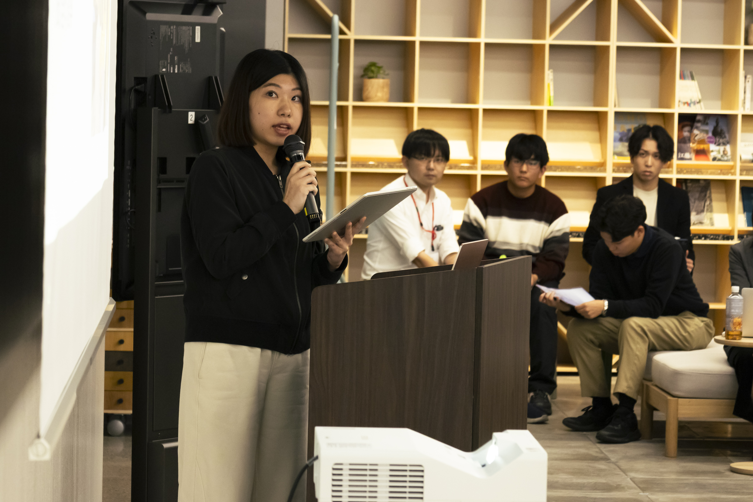法科大学院3年生の西村奈々伽さんは、珠洲市の狼煙町での聞き取り調査について報告。日本財団の支援によって建設された交流スペース「狼煙のみんなの家」を訪問した体験を語りました。