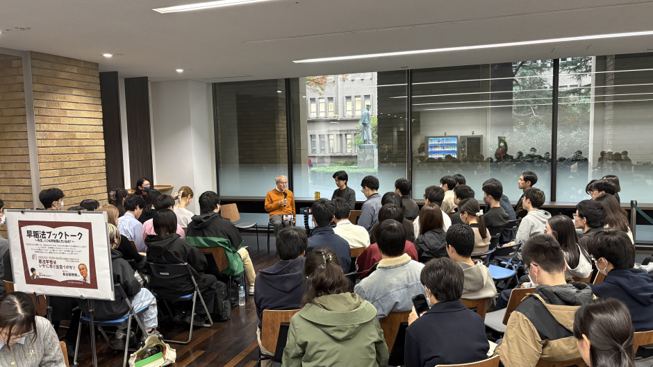 2025年11月5日(水)15時30分から約1時間ほど8号館(法学部棟)1階の学生ラウンジにて「早稲法ブックトーク」が開催されました。
