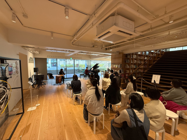 今回も学生、教職員、校友や地域の方々が演奏や鑑賞に訪れました。参加者は約50人で、そのうち約20人が演奏しました。参加者の所属、年齢、国籍はさまざまで、初心者からプロフェッショナルまで幅広い層が集まりました。クラシック、ジャズやポップスをはじめ、幅広いジャンルの音楽が登場しました。映画、ドラマやアニメのサウンドトラックなども登場しました。そして、同じ曲でも、各演奏者の想像や解釈によって、さまざまな演奏方法がありました。演奏の前後、学生スタッフが演奏者の所属、曲名や演奏した感想などについて聞きました。ピアノの後ろに置かれた椅子は、参加者が演奏の合間に音楽について会話をできるスペースになりました。