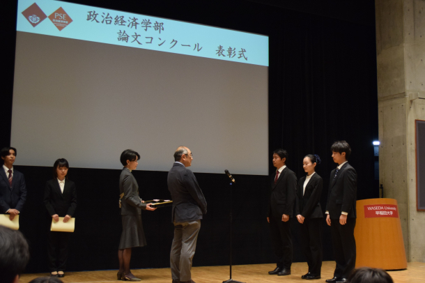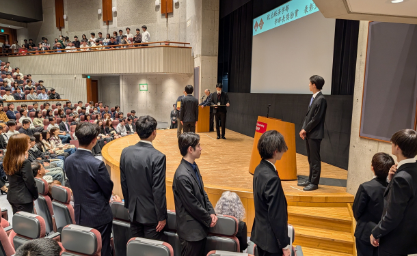 続いて、2025年度政治経済学部 学部長奨励賞の受賞者と、2025年度第26回早稻田大學政治經濟學會論文コンクール受賞者への表彰が行われました。学部長奨励賞は、各学年の成績優秀者に授与される賞です。論文コンクールは、政治経済学部および大学院政治学研究科・同経済学研究科修士課程に在籍するすべての正規学生を対象として毎年実施しているものです。新入生を前に、鎮目雅人学部長(政治經濟學會長)より各受賞者に表彰状が授与されました。