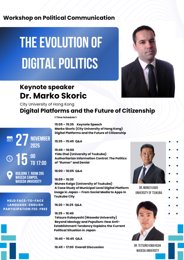 Recent elections and the dynamics of public opinion formation have demonstrated that digital media are profoundly reshaping the political landscape. This workshop on political communication will feature Dr. Marko Skoric (City University of Hong Kong), a leading scholar on the relationship between digital media and citizenship, as the keynote speaker. In addition, three other researchers will present cutting-edge studies that examine the evolving intersections of digital media and politics in both democratic and authoritarian contexts. |