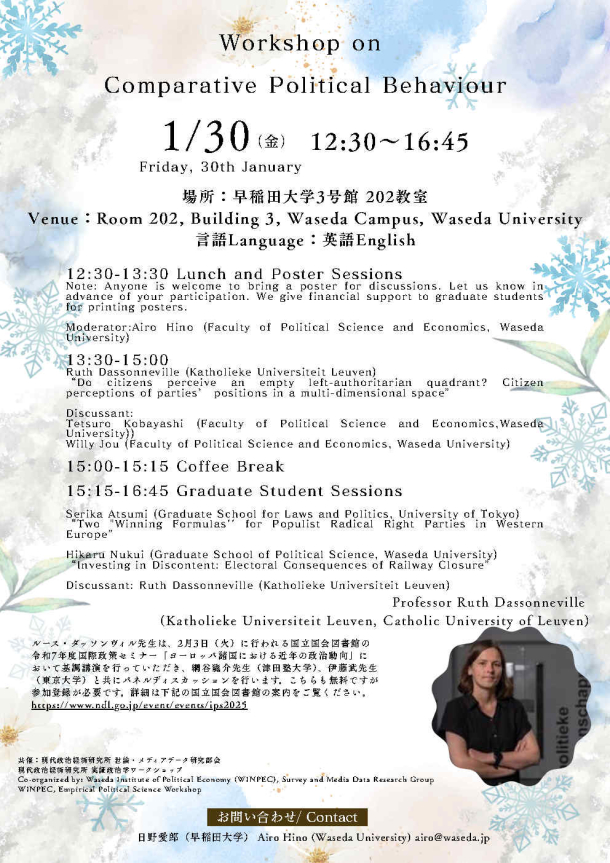 「比較政治行動」をテーマとした特別ワークショップを開催いたします。講師としてカトリック・ルーヴェン大学(Katholieke Universiteit Leuven)のルース・ダッソンヴィル教授をお招きします。ダソンヌヴィル教授は選挙行動の専門家であり、『American Journal of Political Science』『Journal of Politics』『British Journal of Political Science』など多数の学術誌に論文を発表しています。また、アメリカ政治学会選挙・世論・投票行動部門の2024年Emerging Scholar Awardを受賞しています。『British Journal of Political Science』のEditor、『French Politics』のAssociate Editorを務めるほか、2026年から2030年にかけて実施されるComparative Study of Electoral Systems/ Election Surveys (CSES)・モジュール7の企画委員会委員長を務めています。大学院生、ならびに若手研究者の参加を歓迎いたします。大学院生セッションでは2本の報告を予定しております。ポスターセッションでの報告を希望する大学院生には補助いたします。登録は必要ありません。奮ってご参加ください。
