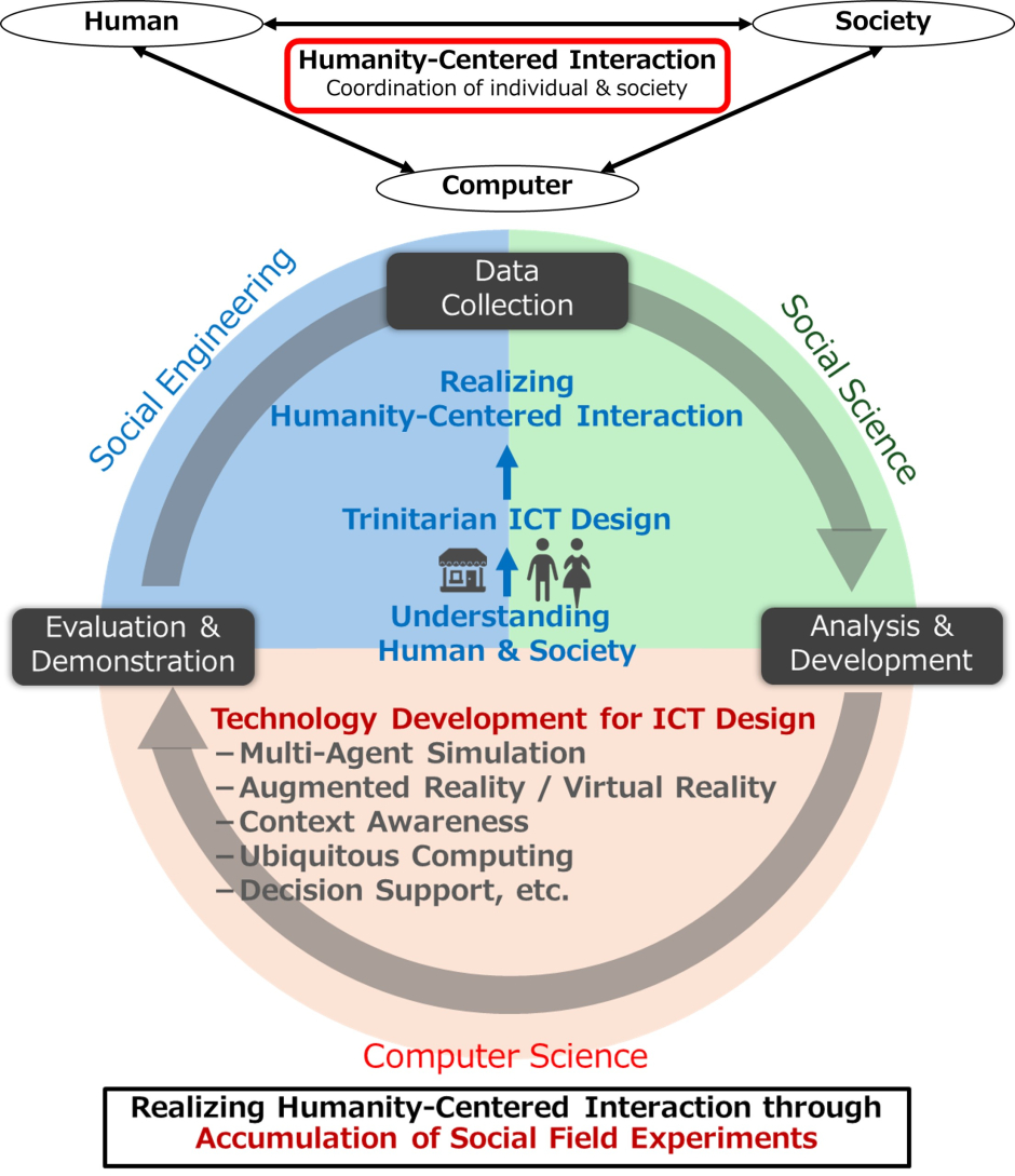 While advances in information and communication technologies and artificial intelligence are rapidly transforming society, gaps often emerge between technology and human values, culture, and social relationships. To address this challenge, our research explores human-, social-, and culture-centered approaches to interaction, aiming to establish more harmonious relationships between technology and people. Specifically, drawing on interaction technologies, simulation methods, and network analysis, we seek to understand and model human behavior and social relationships. Through iterative cycles between theory and real-world field studies, we pursue both technological novelty and practical applicability in the design of information systems and interaction methodologies.