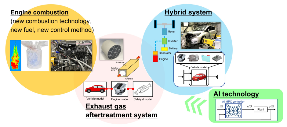 Automobiles are indispensable to human life. In recent years, various powertrain systems have been developed and put into practical use, enabling users to choose not only internal combustion engine vehicles but also hybrid and plug-in hybrid vehicles, electric vehicles, and fuel cell vehicles. Even under such circumstances, there is an increasing demand for further reductions in the environmental impact caused by automobiles. Our laboratory is conducting research aimed at further reducing the fuel consumption and exhaust emissions of powertrain systems. Utilizing both experimental and numerical simulation techniques, we are undertaking research into elucidating the phenomena of each component (engine, catalyst, battery, motor, etc.), modelling these components, developing optimal powertrain systems for each destination, and developing novel powertrain control methodologies.