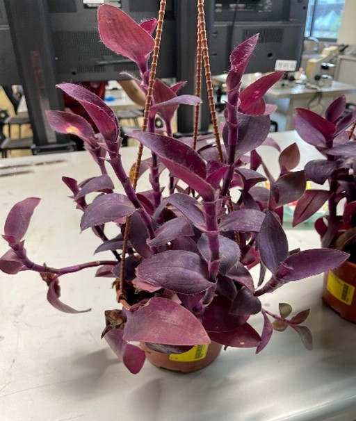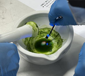 試料はムラサキゴテンを使用し、その紫色の葉から緑色の葉緑体を分離しました。目視では分かりませんが、顕微鏡でムラサキゴテンの葉を観察すると緑色の部分もあることが確認できます。観察後は、葉っぱを砕き、マイクロピペットという器具を上手に使いこなして試薬を加えたり、上澄み液を吸い取ったりしながら溶液を調製し、遠心力によって葉緑体だけを回収しました!