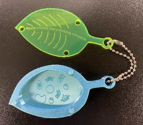 ![]() 記念品として配布した、スタッフ手作りの葉っぱ型小物入れ。本実験教室で使用した植物の葉をイメージし、3Dプリンターとレーザー加工機で作製!中には細胞小器官が描かれています。 |