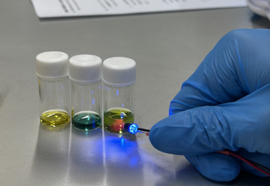 カラムクロマトグラフィーという手法を用いると、植物内の成分をこのように分離して観察できます。分離した溶液に青色LEDの光を当てることで、複数種類ある光合成色素の中でも自家蛍光で赤く光る特徴を持つクロロフィルを判別することができました!