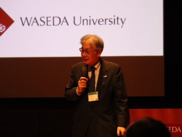 最初に理工総研副所長・高橋大輔先生より開催挨拶をいただき、続いて佐藤さんと高野さんが本プログラムの年間の活動報告を行いました。